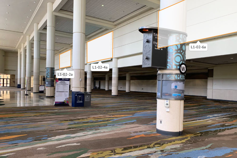 Every effort has been made to ensure the accuracy of all information contained on this photo. However, no warranties, either expressed or implied, are made with respect to this photo. If the location of building columns, utilities or other architectural components of the facility is a consideration in the construction or usage of a graphic element it is the sole responsibility of the client to physically inspect the facility to verify all dimensions and locations. It is the responsibility of the client to get written permission from the Center for any public concourse space to be utilized for sponsorships or advertising.