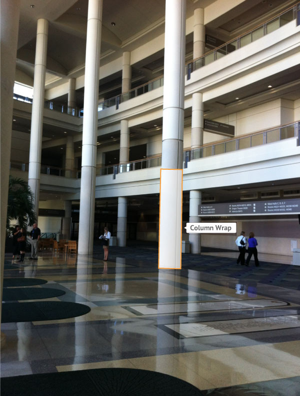 Every effort has been made to ensure the accuracy of all information contained on this photo. However, no warranties, either expressed or implied, are made with respect to this photo. If the location of building columns, utilities or other architectural components of the facility is a consideration in the construction or usage of a graphic element it is the sole responsibility of the client to physically inspect the facility to verify all dimensions and locations. It is the responsibility of the client to get written permission from the Center for any public concourse space to be utilized for sponsorships or advertising.