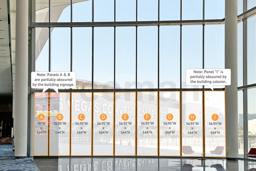 Every effort has been made to ensure the accuracy of all information contained on this photo. However, no warranties, either expressed or implied, are made with respect to this photo. If the location of building columns, utilities or other architectural components of the facility is a consideration in the construction or usage of a graphic element it is the sole responsibility of the client to physically inspect the facility to verify all dimensions and locations.