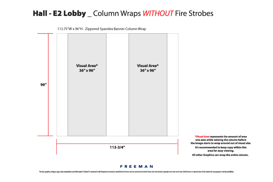 Every effort has been made to ensure the accuracy of all information contained on this photo. However, no warranties, either expressed or implied, are made with respect to this photo. If the location of building columns, utilities or other architectural components of the facility is a consideration in the construction or usage of a graphic element it is the sole responsibility of the client to physically inspect the facility to verify all dimensions and locations. It is the responsibility of the client to get written permission from the Center for any public concourse space to be utilized for sponsorships or advertising.