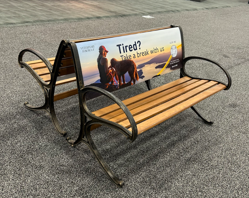 When attendees need a break from standing and walking, they’ll find handy park benches on the show floor — and your branding on the backs of them. Use your signage to direct buyers to your booth once they’ve recharged, let them know where to find you as they walk by and make sure your company name stays on their minds.